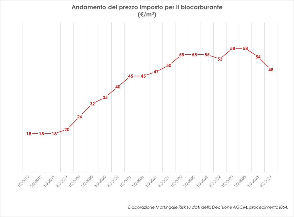 Secondo quanto accertato dall’autorità Antitrust, tra il 1° gennaio 2020 e il 30 giugno 2023 le società coinvolte avrebbero manipolato il prezzo della cosiddetta “componente bio” nei carburanti tradizionali (benzina e gasolio), al fine di ribaltare sul mercato un prezzo simile per tutti i cartellisti, a prescindere dal (minore) costo di produzione. Il valore di questa importante componente del prezzo è aumentato da circa 20€/mc del 2019 a circa 60 €/mc del 2023, con effetti diretti sui costi sostenuti dagli operatori economici a valle (v. grafico sotto).