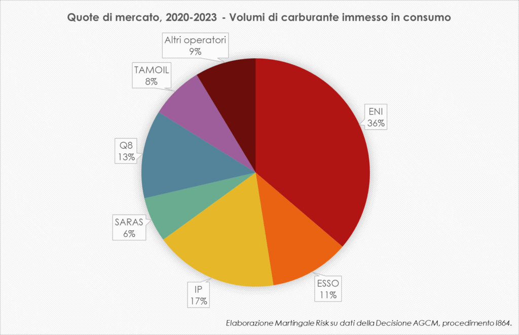 In termini concreti, ciò significa che migliaia di imprese italiane del settore — dalle grandi flotte ai piccoli autotrasportatori indipendenti — hanno comprato il carburante ad un prezzo indebitamente maggiorato dalle società petrolifere partecipanti al cartello (Eni, Esso, IP, Q8, Saras e Tamoil) che hanno rappresentato, tra il 2020 e il 2023, tra l’85 ed il 95% dell’intero mercato italiano (v. grafico sotto).